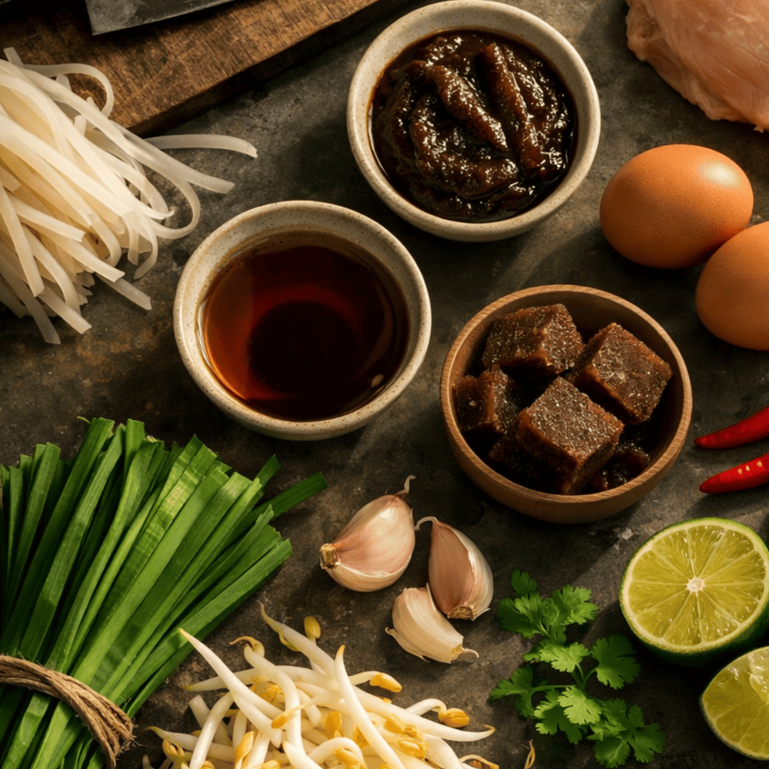 Schichten: Gieße die vorbereitete Tamarinden-Fischsauce-Palmzucker Mischung in die Pfanne. Sie soll leicht blubbern, aber nicht karamellisieren. Lege die abgetropften Reisbandnudeln flach in die Pfanne und verteile sie gleichmäßig. Beträufle sie anschließend mit ca. 50 ml Wasser. Lege das angebratene Hähnchen als oberste Schicht auf die Nudeln. Nicht mischen, damit das Fleisch ausschließlich im Dampf gart und saftig bleibt.