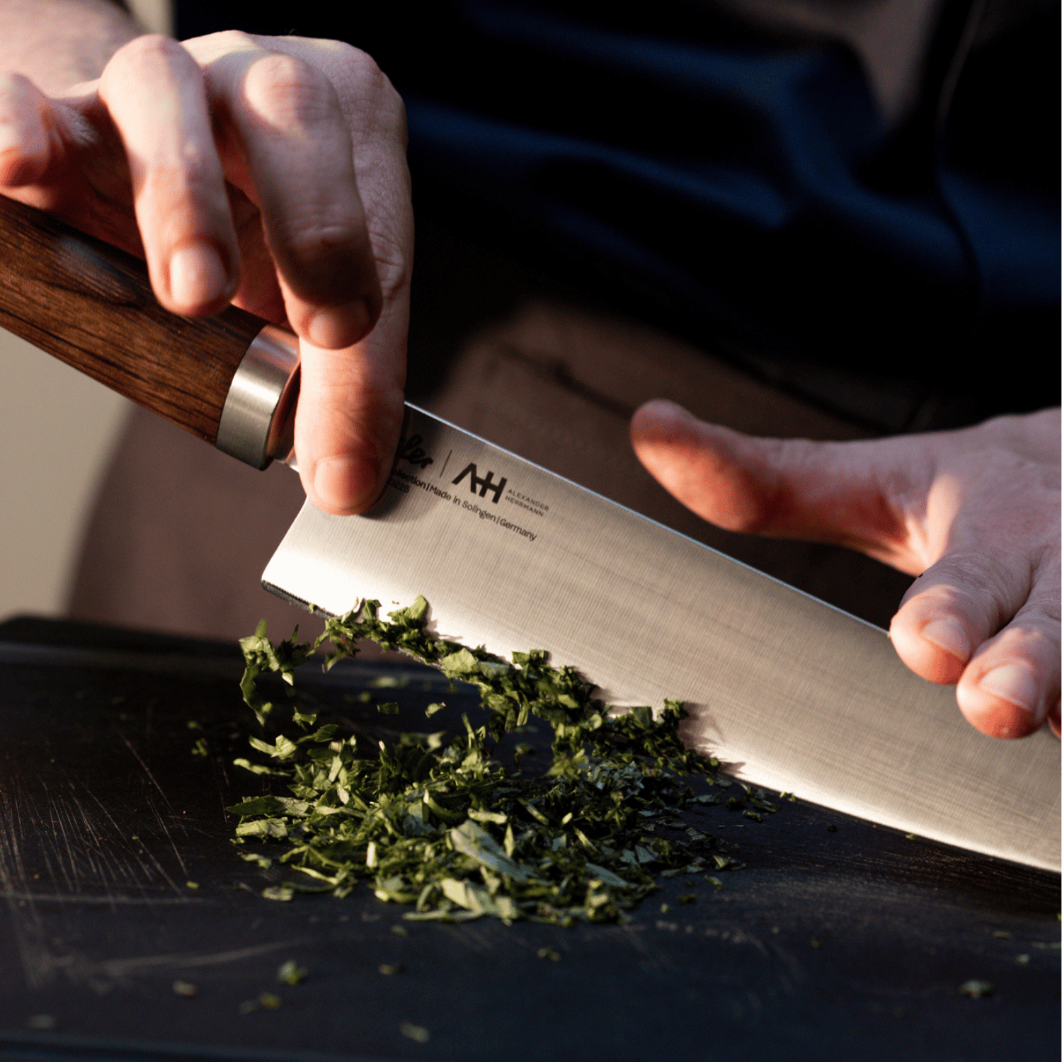 Hähnchenschnitt: Schneide das Fleisch in hauchdünne, fast transparente Scheiben (Tranchen) quer zur Faser. So bleibt es schön zart.