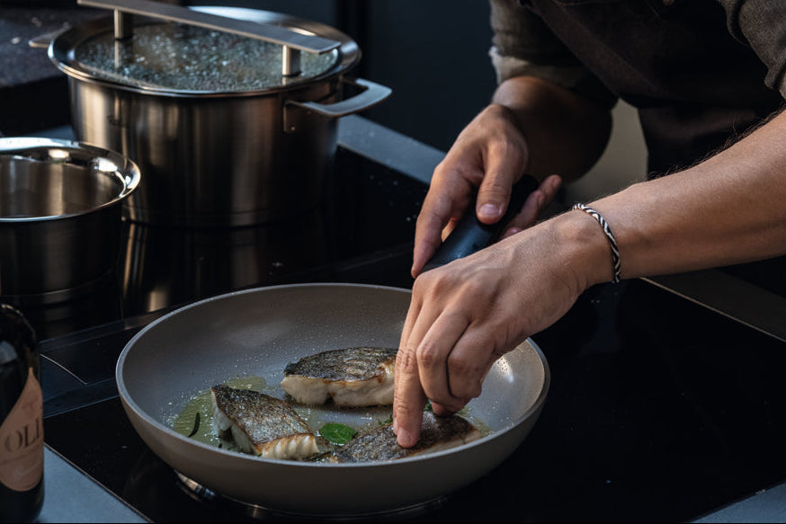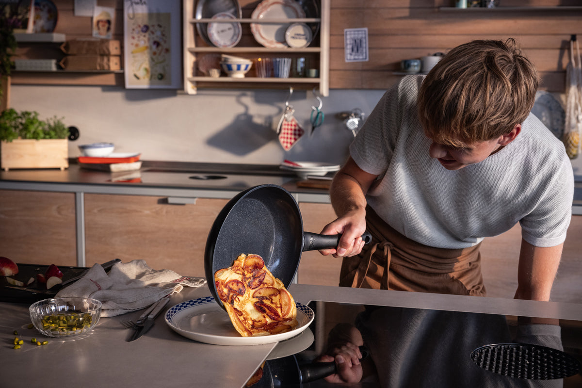 Die Feigen mit einem feuchten Küchentuch abreiben und halbieren. Mit der Brat- & Servierpfanne der Serie Original-Profi Collection® ohne Fett erhitzen und die Feigen darin auf der Schnittfläche kurz anbraten. Mit dem Rum ablöschen, anzünden und warten, bis die Flamme erlischt.
