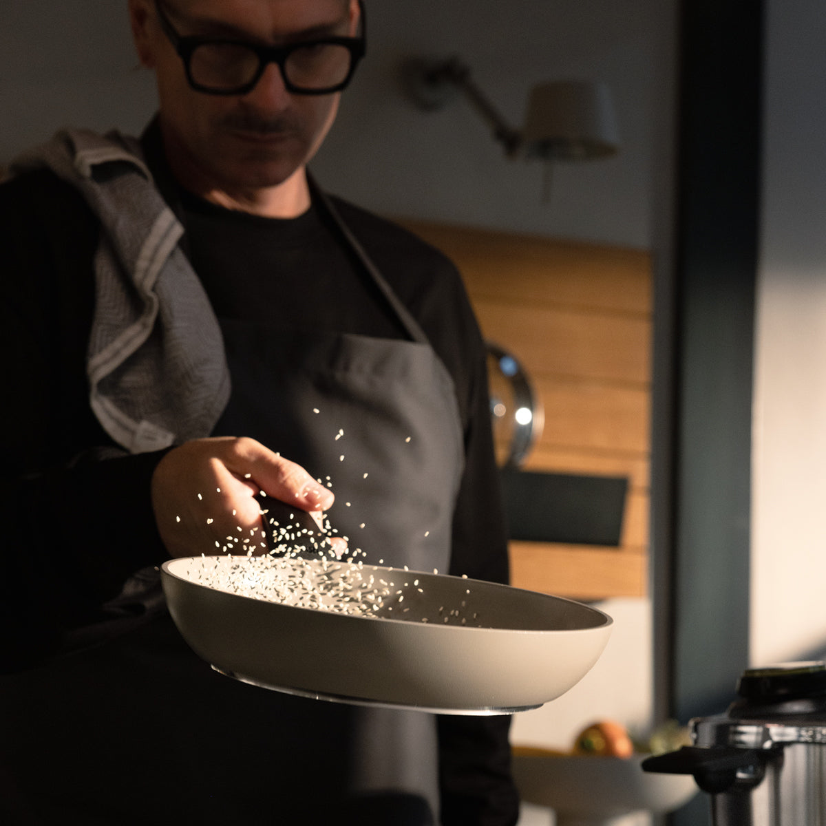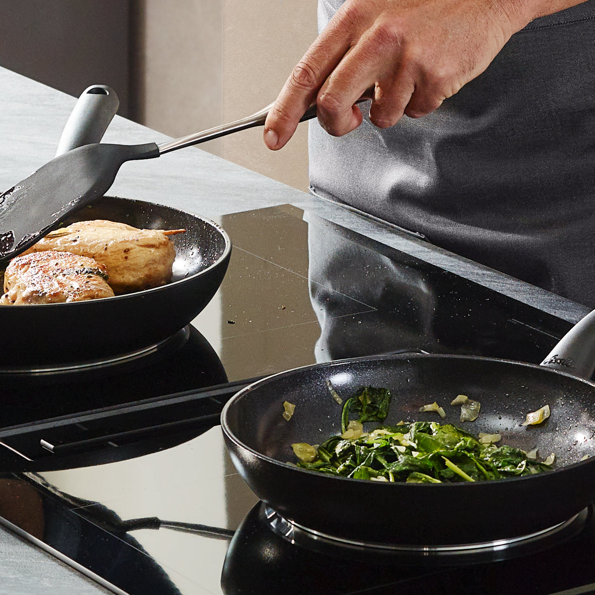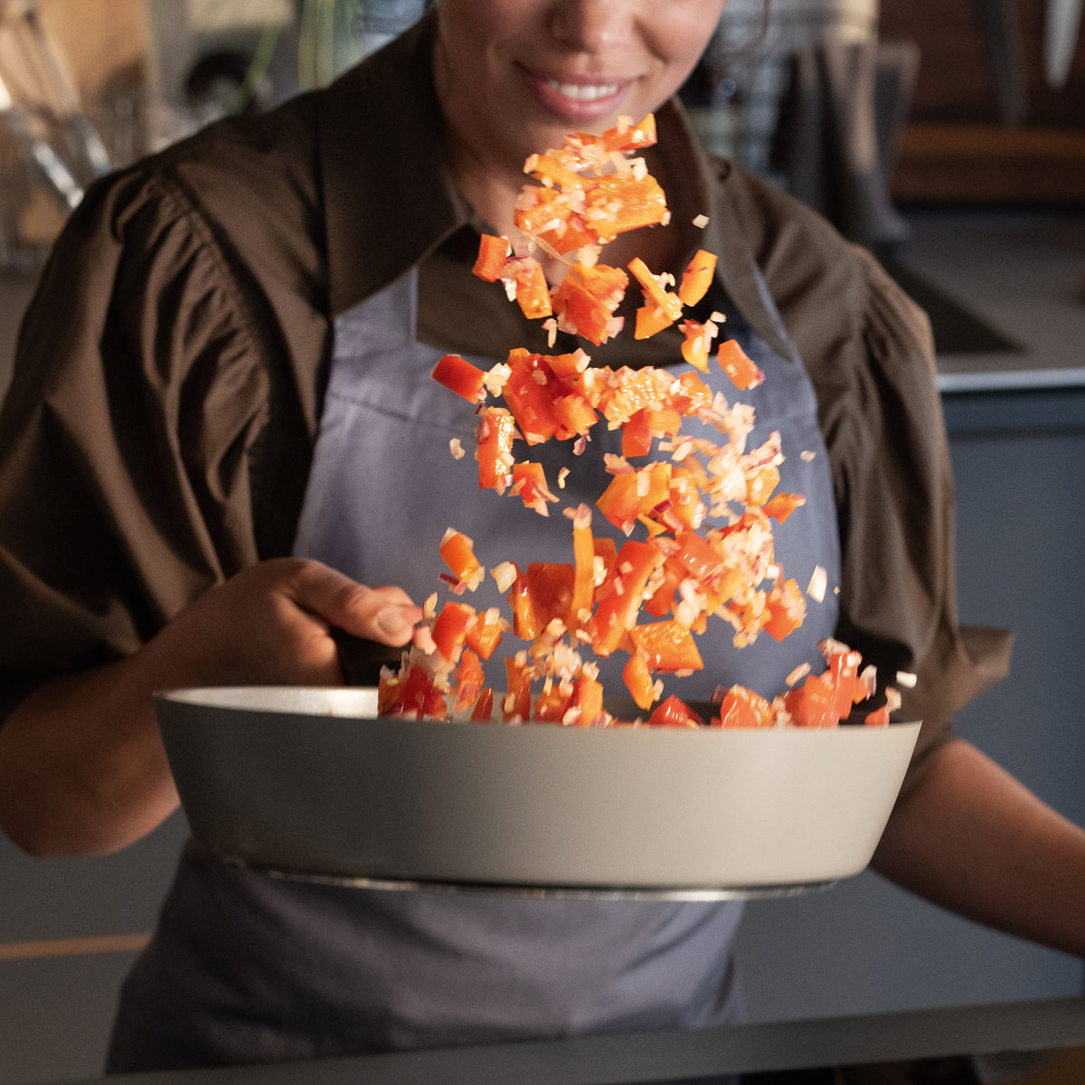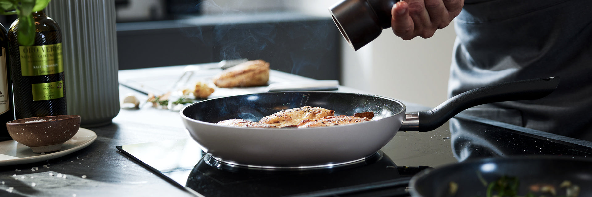 Am beliebtesten ist die klassische Beschichtung aus Polytetrafluorethylen, kurz PTFE. Keramikpfannen hingegen werden ohne den Einsatz von PFAS (Per- und polyfluorierte Alkylsubstanzen) bzw. PTFE hergestellt. Auch Fissler Keramikpfannen verfügen über eine keramische Beschichtung frei von PFAS/PTFE.