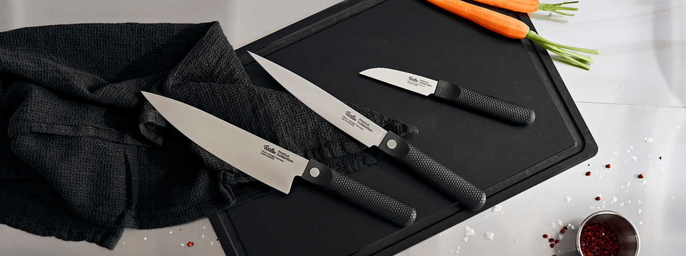 The Fissler ProCut Collection, manufactured in Solingen , the heart of German knife-making, offers the ideal cutting tool for all common cutting tasks. The laser cutting process allows for the use of a particularly hard blade steel with a hardness of 59 HRC. This enables the blade to be ground thinner and achieve an extremely sharp edge.
