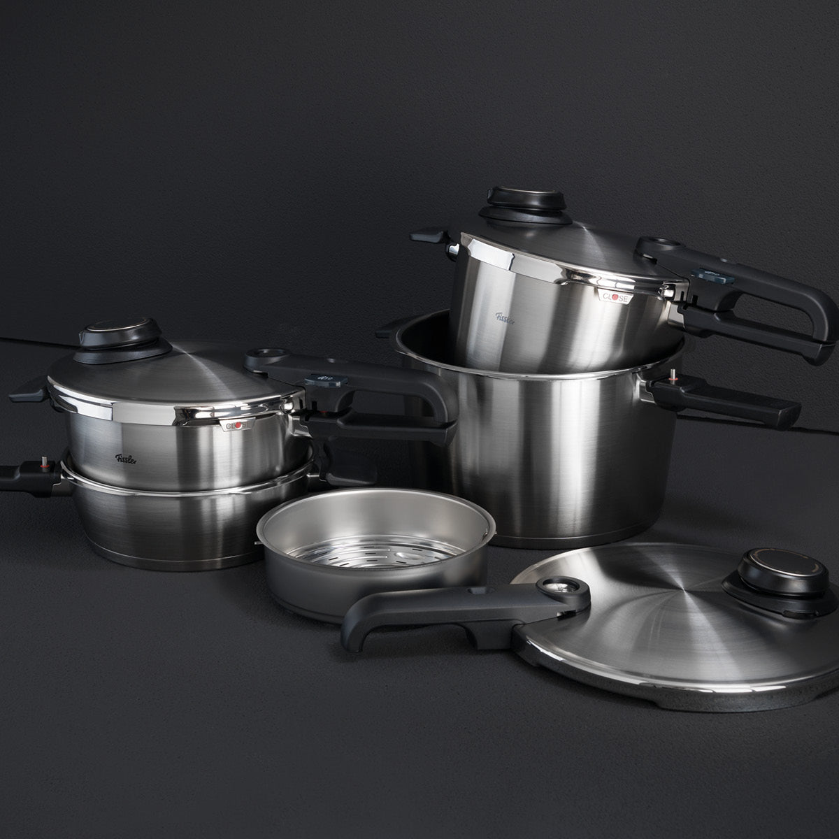 - After heating up, the Fissler pressure cookers also unfoldat medium stove powertheir full power. This allows for energy consumption during cooking.by up to 50%reduce.