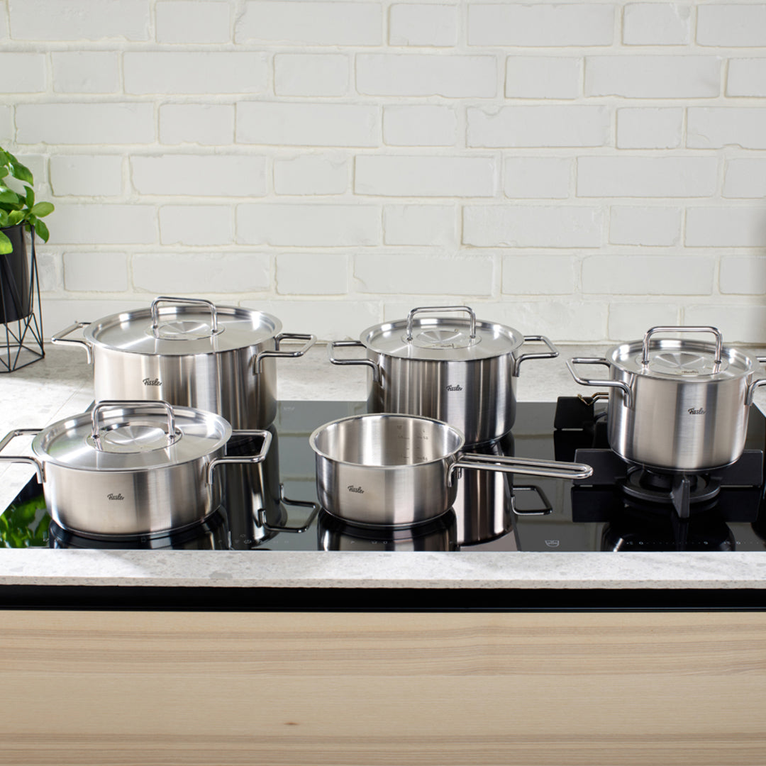 The 4-piece pot set from the Fissler Pure Collection consists of three cooking pots and a roasting pot, each with a metal lid. With this set, budding amateur chefs and families have the right equipment for every task in the kitchen.