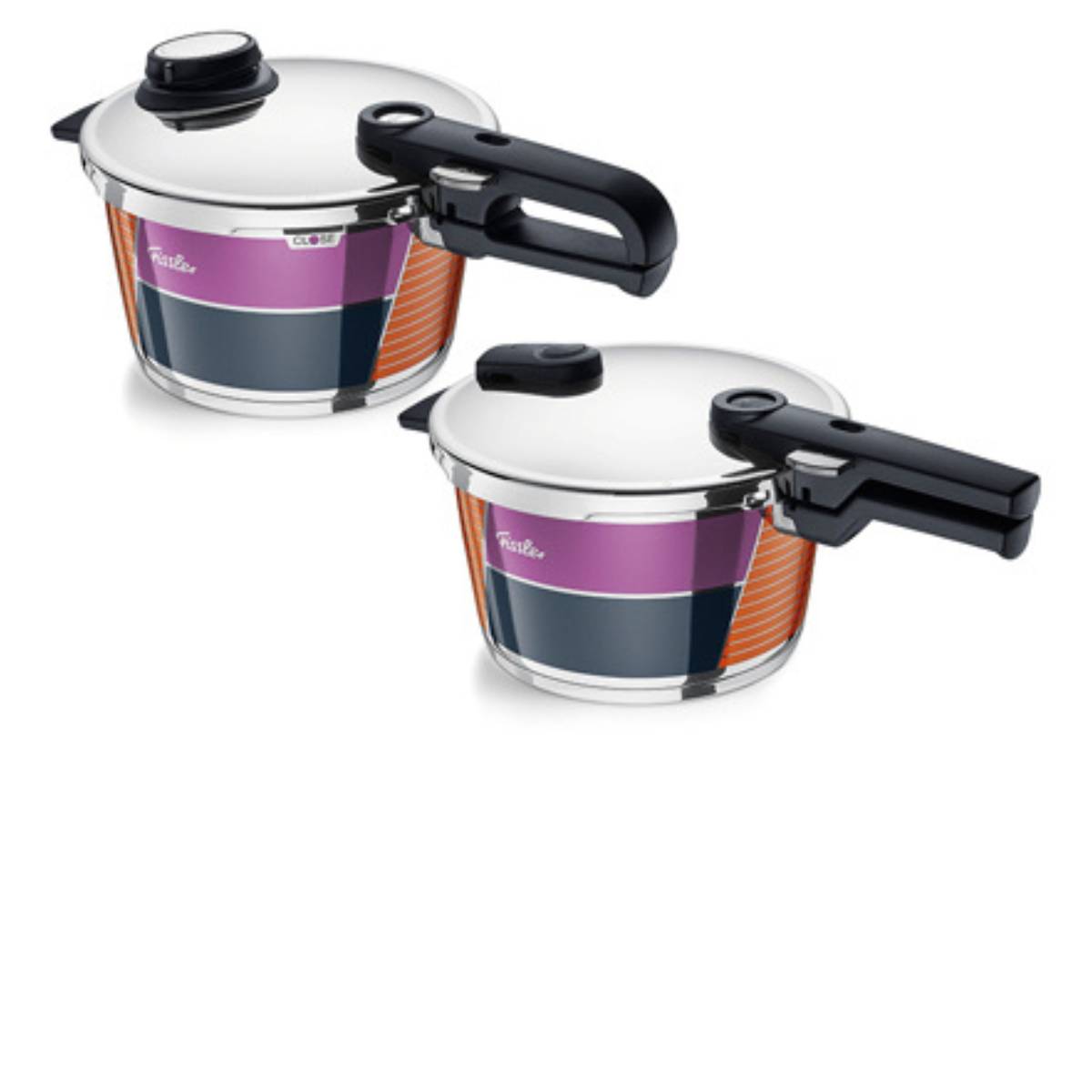70 Jahre Schnellkochen: Fissler feiert die Erfindung des sicheren Schnellkochtopfs mit zwei besonderen Jubiläumseditionen. Das Design der limitierten Vitavit®und Vitaquick® Serie ist inspiriert von der Mode und den Farben der modernen Kunst der 50er Jahre. Die Schnellkochtöpfe erstrahlen im „Colour Blocking“ Design, das diese Epoche geprägt hat.
