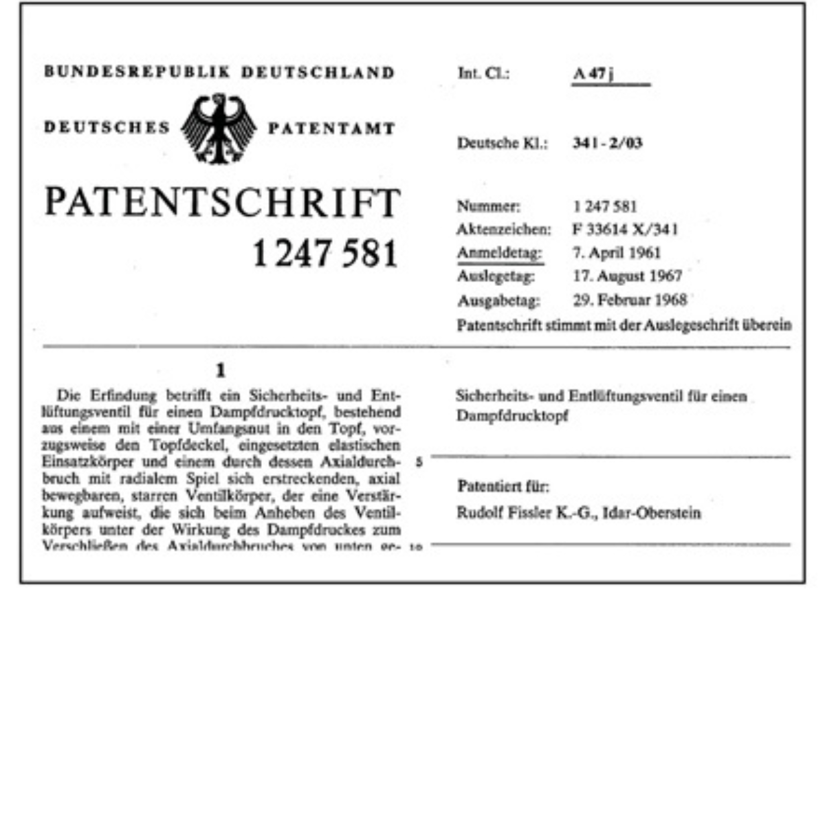 Fissler patentiert die Unimatik - ein „Sicherheits- und Entlüftungsventil für einen Dampfdrucktopf“. Neben dem automatischen Entlüften des Überdrucks, verhindert das Ventil erstmals ein unerwünschtes Austreten des Topfinhalts über das Ventil.