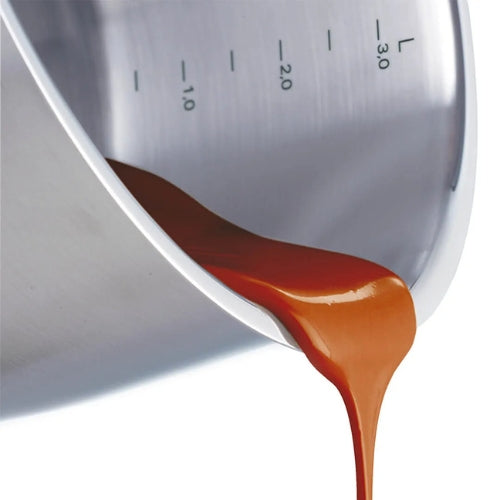 Robuste und langlebige Eisenlegierung mit hohem Kohlenstoffgehalt, die Wärme besonders gut leitet und speichert, hergestellt aus Gusseisen in authentischer französischer Profi-Qualität.